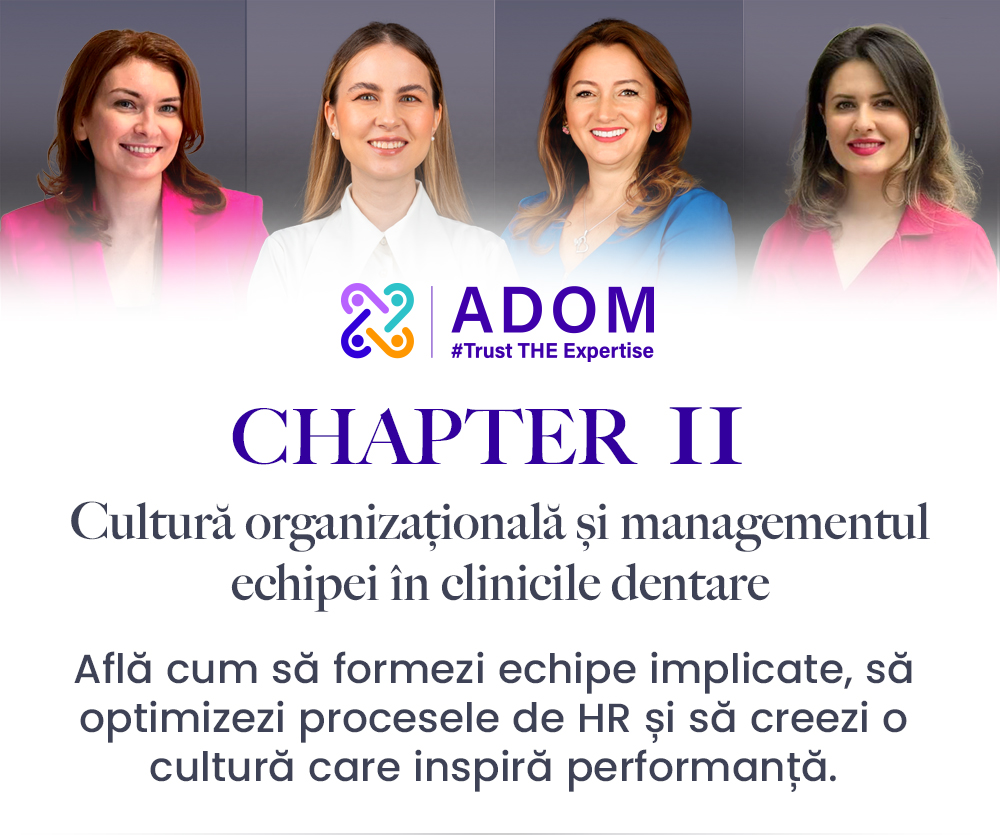 Acest curs face parte din seria intensivă ADOM Chapters, dedicată managerilor și antreprenorilor din stomatologie care doresc să ducă performanța echipei și a clinicii la următorul nivel.